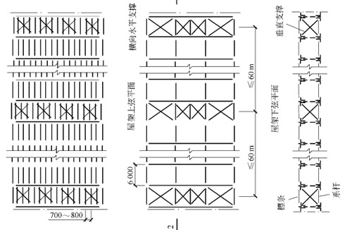 在沿廠房縱向每間隔4~6個屋架應設置垂直支撐,以保證屋架安裝時的穩(wěn)定性。系桿在未設橫向支撐的開間,相鄰平面屋架由系桿連接。系桿通常在屋架兩端,有垂直支撐位置的上、下弦節(jié)點以及屋脊和天窗側柱位置,沿房屋縱向通長布置。系桿對屋架上、下弦桿提供側向支承,因此必要時,還應根據控制這些弦桿長細比的要求按一定距離增設中間系桿。對于有檁屋蓋,檁條可兼作系桿。