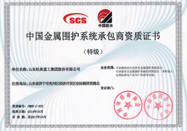 經(jīng)典集團喜獲中國金屬圍護系統(tǒng)承包特級資質(zhì)