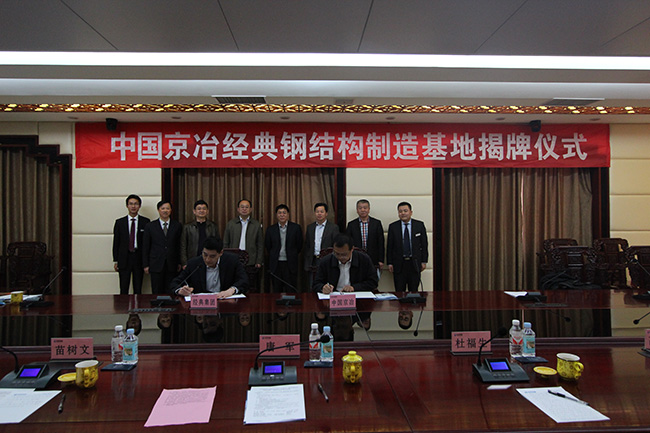 揭牌儀式前,中國(guó)京冶鋼結(jié)構(gòu)事業(yè)部常務(wù)副總經(jīng)理常好誦和經(jīng)典集團(tuán)董事長(zhǎng)苗樹文在公司三樓會(huì)議中心共同簽訂了戰(zhàn)略合作框架協(xié)議。中國(guó)京冶與經(jīng)典集團(tuán)將本著平等、誠(chéng)信、互惠、共贏的原則,利用各自優(yōu)勢(shì)在鋼結(jié)構(gòu)建筑領(lǐng)域建立長(zhǎng)期戰(zhàn)略合作伙伴關(guān)系,在高層、超高層鋼結(jié)構(gòu)建筑、大跨度鋼結(jié)構(gòu)建筑、鋼結(jié)構(gòu)住宅產(chǎn)業(yè)化、鋼結(jié)構(gòu)工程設(shè)計(jì)施工制造管理、節(jié)能環(huán)保維護(hù)系統(tǒng)等領(lǐng)域開展項(xiàng)目工程合作、科研與技術(shù)合作。