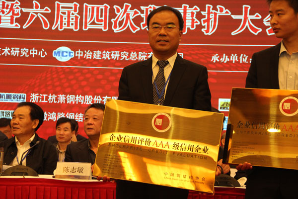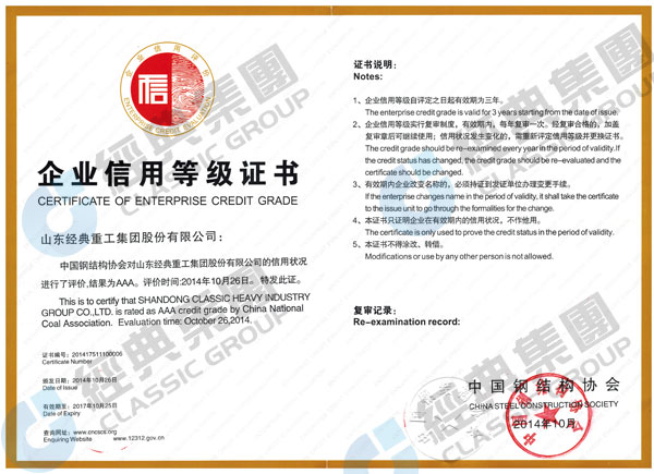 2014年10月26-27日,在南京國(guó)際會(huì)議中心隆重舉辦的中國(guó)鋼結(jié)構(gòu)協(xié)會(huì)成立三十周年紀(jì)念大會(huì)暨六屆四次理事會(huì)擴(kuò)大會(huì)議上,山東經(jīng)典重工集團(tuán)股份有限公司獲得首批全國(guó)鋼結(jié)構(gòu)行業(yè)AAA級(jí)信用企業(yè)。