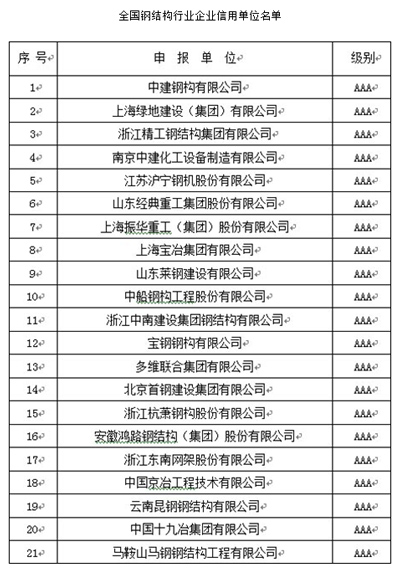 AAA信用評(píng)選由國(guó)家商務(wù)部、國(guó)資委、國(guó)家鋼結(jié)構(gòu)專家委員會(huì)面向全國(guó)3500余家鋼結(jié)構(gòu)制造、設(shè)計(jì)、建筑企業(yè),經(jīng)過(guò)層層選拔、資格初審復(fù)審、專家集中評(píng)審及面向社會(huì)公示后,中建鋼構(gòu)、上海綠地集團(tuán)、上海寶冶、杭蕭鋼構(gòu)、首鋼集團(tuán)、寶鋼集團(tuán)、振華重工等21家國(guó)有大型企業(yè)被評(píng)定為首批全國(guó)鋼結(jié)構(gòu)行業(yè)AAA級(jí)信用企業(yè),山東經(jīng)典重工集團(tuán)股份有限公司成為唯一獲此殊榮的山東省民營(yíng)企業(yè)。