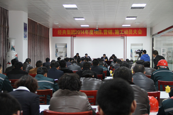 2月7日,為推進(jìn)2014年度戰(zhàn)略目標(biāo)順利實(shí)施,經(jīng)典集團(tuán)隆重召開項(xiàng)目、營(yíng)銷、施工動(dòng)員大會(huì)。集團(tuán)公司高層領(lǐng)導(dǎo)苗樹文、杜福生、鄭建康、司紅玲、鄭利昌、高建國(guó)出席了此次會(huì)議,集團(tuán)公司有關(guān)部門負(fù)責(zé)人、項(xiàng)目經(jīng)理、營(yíng)銷人員、施工隊(duì)長(zhǎng)、生產(chǎn)車間負(fù)責(zé)人等80余人參加了此次大會(huì)。