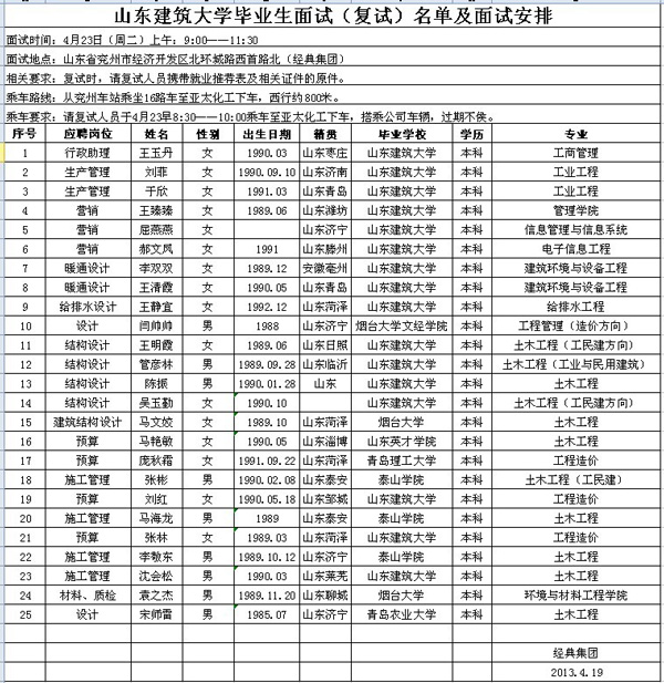 山東建筑大學(xué)畢業(yè)生面試(復(fù)試)名單及面試安排