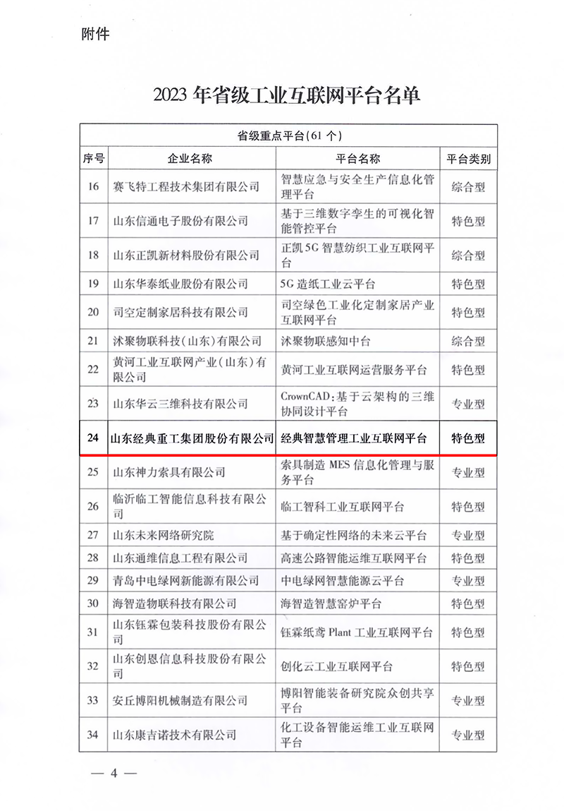 近日,山東省工業(yè)和信息化廳發(fā)布了《2023年省級工業(yè)互聯(lián)網(wǎng)平臺(tái)名單》,山東經(jīng)典重工集團(tuán)股份有限公司“經(jīng)典智慧管理工業(yè)互聯(lián)網(wǎng)平臺(tái)”成功入選山東省級工業(yè)互聯(lián)網(wǎng)重點(diǎn)平臺(tái)名單。
