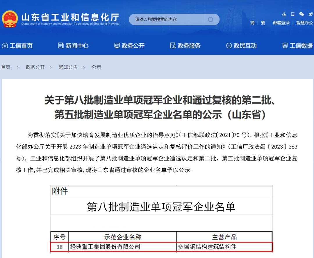近日,工業(yè)和信息化部第八批制造業(yè)單項冠軍示范企業(yè)名單公示,經(jīng)典重工集團(tuán)股份有限公司位列其中,是該榮譽(yù)歷批次認(rèn)定中唯一一家建筑鋼結(jié)構(gòu)行業(yè)民營企業(yè)。