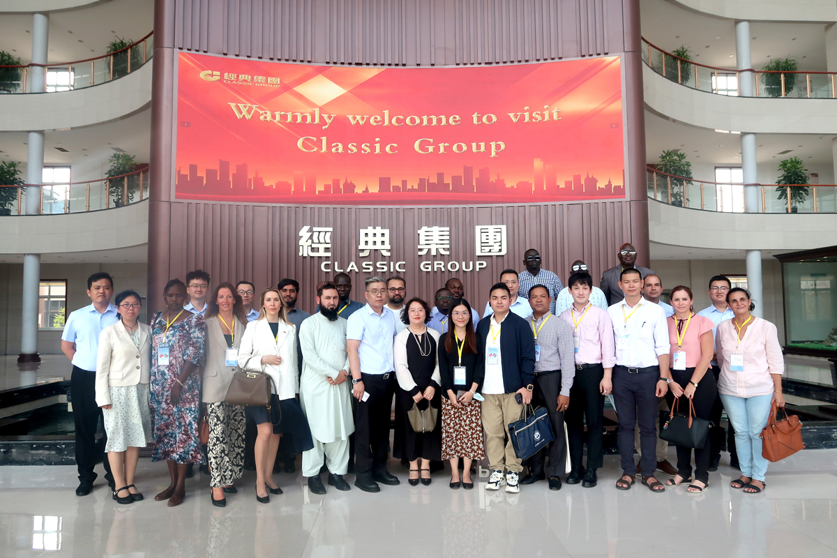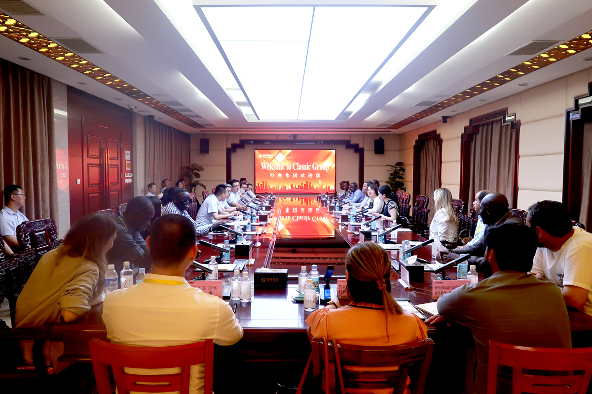 6月11日下午,由商務(wù)部主辦、山東外貿(mào)職業(yè)學(xué)院承辦的“發(fā)展中國家‘中國經(jīng)驗-中國社會制度與公共政策’研修班”一行20余人,在山東外貿(mào)職業(yè)學(xué)院援外培訓(xùn)辦公室主任王保紅的帶隊下,蒞臨經(jīng)典集團參觀交流。經(jīng)典集團副總經(jīng)理兼生產(chǎn)總工張琦、副總經(jīng)理侯士輝陪同。