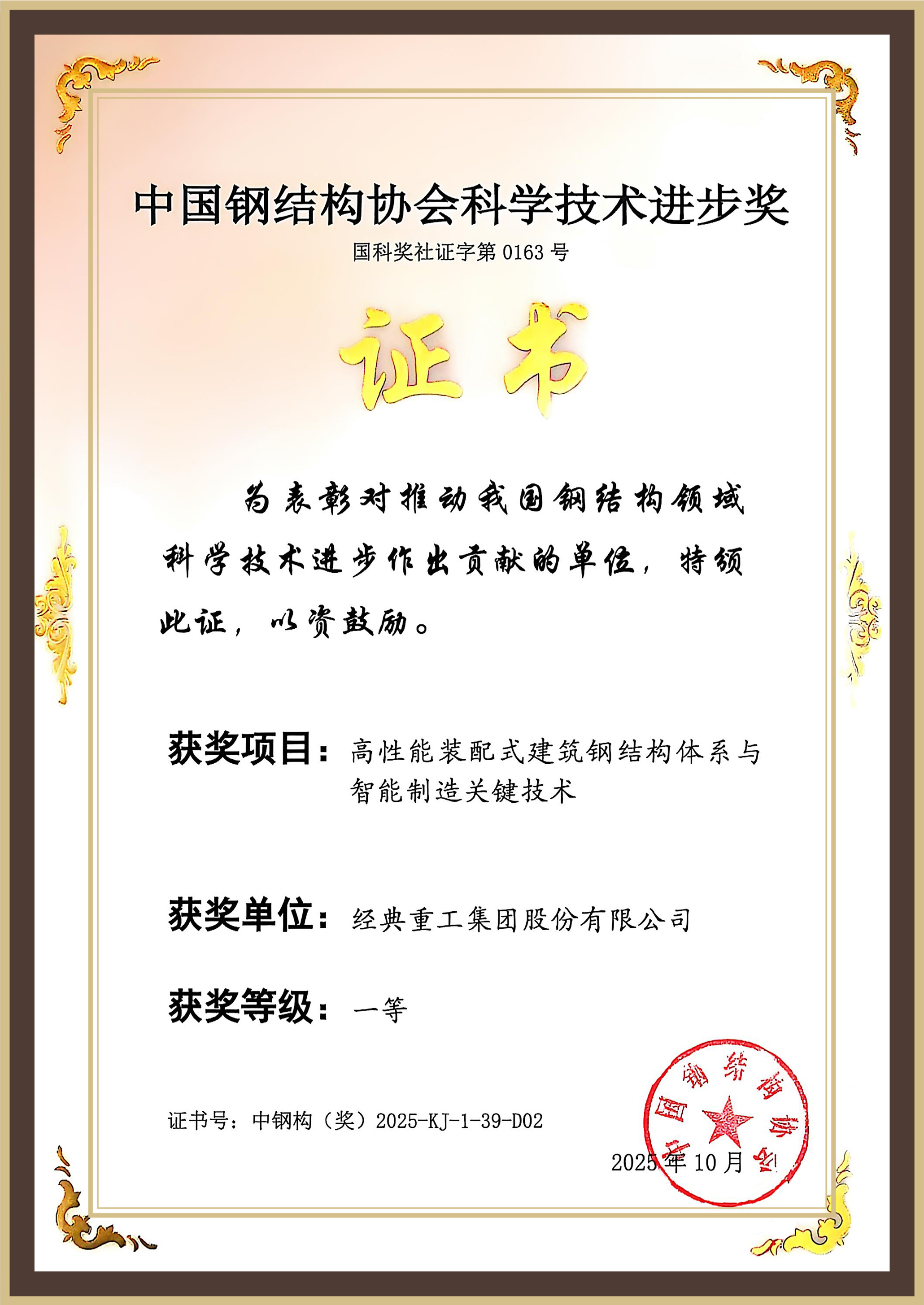 在科學(xué)技術(shù)獎(jiǎng)?lì)C獎(jiǎng)典禮上,經(jīng)典重工集團(tuán)股份有限公司作為主要科研單位參與的《高性能裝配式建筑鋼結(jié)構(gòu)體系與智能制造關(guān)鍵技術(shù)》項(xiàng)目榮獲中國(guó)鋼結(jié)構(gòu)協(xié)會(huì)科學(xué)技術(shù)進(jìn)步獎(jiǎng)一等獎(jiǎng)。